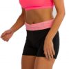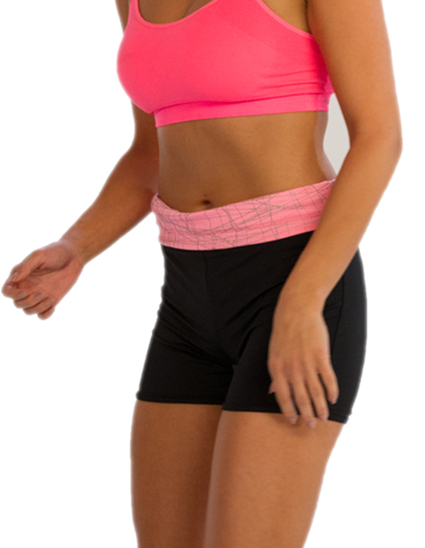 The ladies black shorts with neon pink waistband is a very colorful and vibrant option for the monotonous gym sessions. The length and cut of this black high waisted shorts being perfect and innovative, marks for its fashion forward essence, whereas the use of stretchable fabric adds to the flexibility of the wearer to move freely while working out. Wear Gym Apparel with pink or black sports bra and show of your midriff with poise.